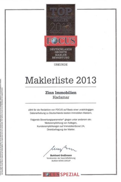 Zinn Immobilien wurde das nebenstehendes Zertifikat zugeteilt.